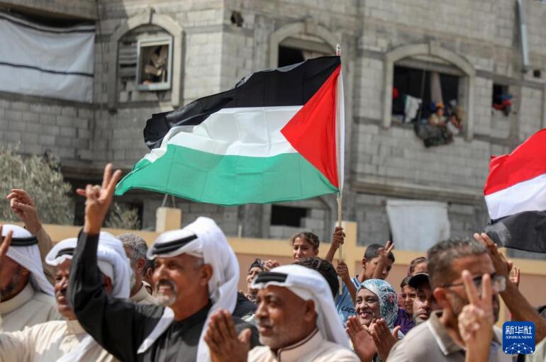 10月9日,在加沙地带中部代尔拜拉赫,巴勒斯坦民众在获悉加沙停火协议的消息后庆祝。 新华社发(里泽克·阿卜杜勒贾瓦德摄)