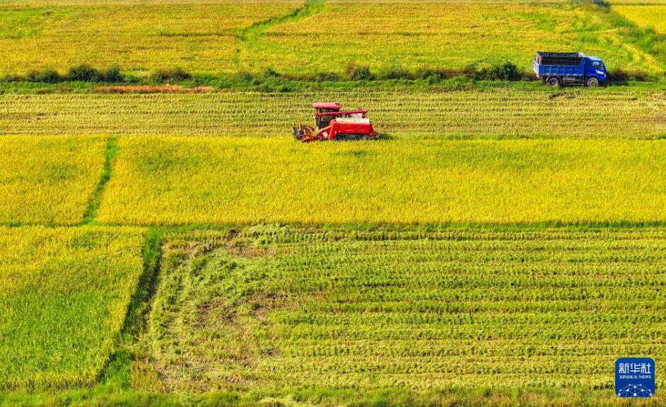 10月11日,湖南省常宁市洋泉镇农民驾驶收割机在收获水稻(无人机照片)。 新华社发(周秀鱼春摄)