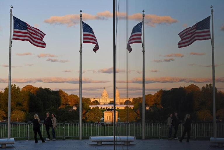 10月8日,在美国华盛顿,人们以国会大厦为背景留影。新华社记者李睿摄