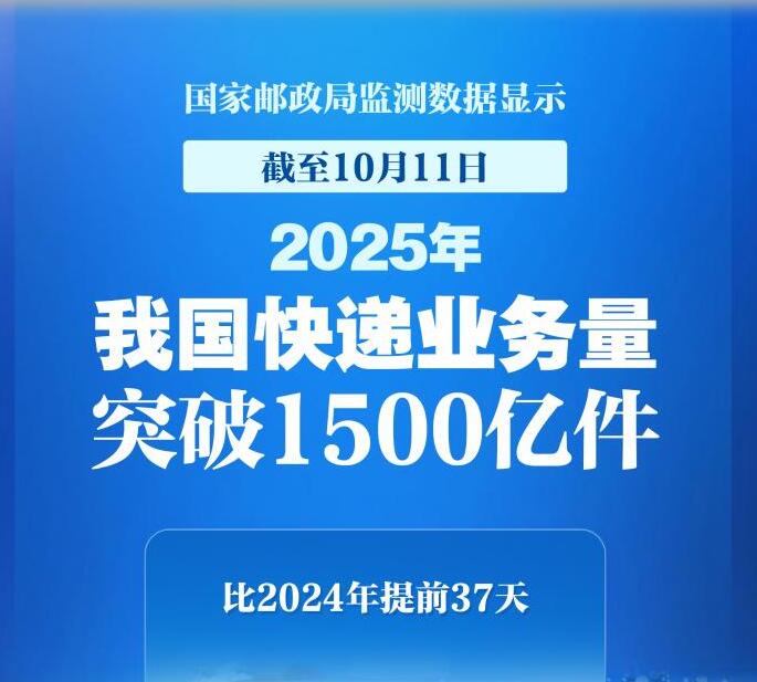 新华社北京10月12日电(记者叶昊鸣)记者12日从国家邮政局获悉,根据国家邮政局监测数据显示,截至10月11日,2025年我国快递业务量突破1500亿件,比2024年提前37天。