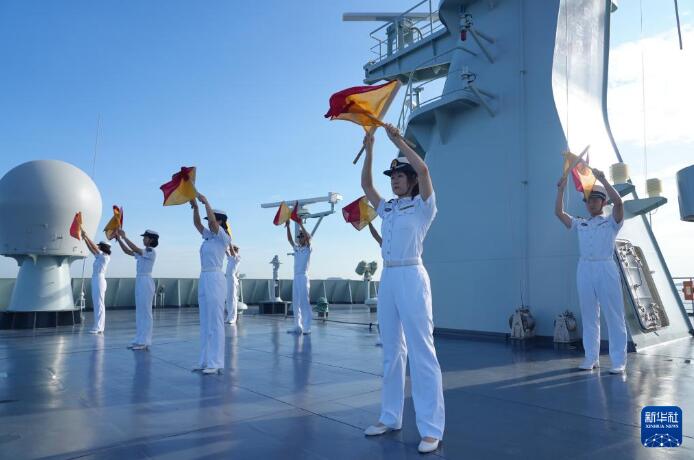 10月16日,戚继光舰官兵在指定海域向泰国“象岛”号登陆舰展示旗语。新华社发