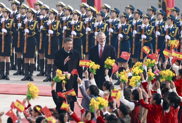 11月12日上午,国家主席习近平在北京人民大会堂会见来华进行国事访问的西班牙国王费利佩六世。这是习近平和夫人彭丽媛同费利佩六世和王后莱蒂西娅合影。新华社记者 黄敬文 摄 新华社北京11月12日电(记者冯歆然)11月12日上午,国家主席习近平在北京人民大会堂会见来华进行国事访问的西班牙国王费利佩六世。 习近平欢迎费利佩六世国王访华,指出中国和西班牙都有深厚的历史文化底蕴。建交50多年来,两国坚持从战略高度和长远角度看待和发展双边关系,相互尊重、相互支持、相互成就,树立了不同历史文化、不同社会制度国家友好相处、共谋发展的典范,也为推动全球开放合作、维护国际公平正义发挥了重要作用。西班牙王室为中西关系发展作出了突出贡献。在两国迎来建立全面战略伙伴关系20周年之际,费利佩六世国王对中国进行国事访问,对推动两国友好合作不断向前发展具有重要意义。 习近平强调,中方珍视同西班牙的传统友好,重视西班牙在国际和地区事务中的独特作用,愿同西班牙一道,携手打造更有战略定力、更富发展活力、更具国际影响力的全面战略伙伴关系。双方要进一步坚定相互支持,保持高层交往势头,加强战略引领,确保两国关系始终走在正确道路上。要进一步推进务实合作,中方愿进口更多西班牙优质产品,挖掘新能源、数字经济、人工智能等新兴领域合作潜力,扩大相互投资,打造更多标志性项目。双方还可以优势互补,共同开拓拉美等第三方市场。要进一步促进民心相通,加强文化教育领域交流,相互支持办好各自在对方国家的文化和语言机构。中方将继续延长实施对西免签政策,便利人员往来,让两国民众越走越亲。 习近平指出,今年是联合国成立80周年。当今世界进入新的动荡变革期,和平与发展事业依然任重道远。我提出推动构建人类命运共同体,就是希望各国超越社会制度差异和意识形态分歧,通过对话和协商凝聚共识,共同把各国人民对美好生活的向往变成现实。中方愿同西班牙一道,支持联合国在国际事务中发挥核心作用,维护自由贸易规则和国际经贸秩序,构建更加公正合理的全球治理体系,推动构建人类命运共同体。 11月12日上午,国家主席习近平在北京人民大会堂会见来华进行国事访问的西班牙国王费利佩六世。新华社记者 殷博古 摄 费利佩六世表示,很高兴在西中全面战略伙伴关系20周年之际对中国进行国事访问。西班牙同中国的友好交往源远流长,建交以来,两国始终相互信任、相互尊重,致力于共同发展繁荣。中国的发展成就举世瞩目,令人钦佩,特别是在脱贫和绿色低碳发展方面的成功经验值得借鉴。西班牙政府坚定不移奉行一个中国政策,支持维护国家领土完整,愿同中方推动两国全面战略伙伴关系不断向前发展,为两国人民带来更多福祉,为世界和平稳定作出更大贡献。中国企业投资有力促进了西班牙经济发展和绿色转型。西方愿同中方保持密切交往,把握中方实施“十五五”规划带来的重要机遇,加强经贸、工业、科技、绿色能源等领域合作。感谢中方对西班牙实施免签政策,愿密切文化、语言、旅游领域交流,增进人民友好。历史只能向前,不能倒退。西中两国在很多国际问题上理念高度一致,都支持多边主义,支持通过对话协商解决争端。西班牙高度赞赏习近平主席提出的四大全球倡议,愿同中方共同应对国际形势中的不确定性,维护国际贸易秩序,促进全球经济稳定发展。 会见后,两国元首共同见证签署经贸、科技、教育等领域10份合作文件。 11月12日上午,国家主席习近平在北京人民大会堂会见来华进行国事访问的西班牙国王费利佩六世。这是会见前,习近平在人民大会堂东门外广场为费利佩六世举行欢迎仪式。新华社记者 丁海涛 摄 11月12日上午,国家主席习近平在北京人民大会堂会见来华进行国事访问的西班牙国王费利佩六世。这是会见前,习近平在人民大会堂东门外广场为费利佩六世举行欢迎仪式。新华社记者 谢环驰 摄 会见前,习近平和夫人彭丽媛在人民大会堂东门外广场为费利佩六世和王后莱蒂西娅举行欢迎仪式。 费利佩六世抵达时,礼兵列队致敬。习近平同费利佩六世登上检阅台,军乐团奏中西两国国歌,天安门广场鸣放礼炮21响。费利佩六世在习近平陪同下检阅中国人民解放军仪仗队,并观看分列式。 当晚,习近平和彭丽媛为费利佩六世夫妇举行欢迎宴会。 王毅参加上述活动。