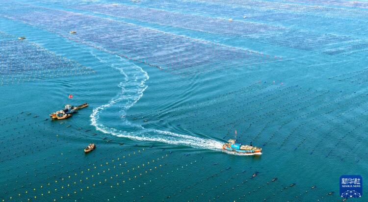 11月19日,在山东省荣成市爱伦湾海带养殖区,工人进行海带播苗作业(无人机照片)。 眼下,山东省荣成市海带播苗作业全面展开,养殖工人们抓紧时间进行夹苗、播苗等作业。 新华社发(杨志礼摄)