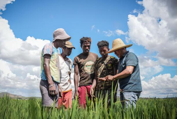 3月25日,在马达加斯加首都塔那那利佛附近的中国杂交水稻高产示范基地,中国农业技术专家胡月舫向当地稻农讲解水稻生长情况。新华社记者李亚辉摄