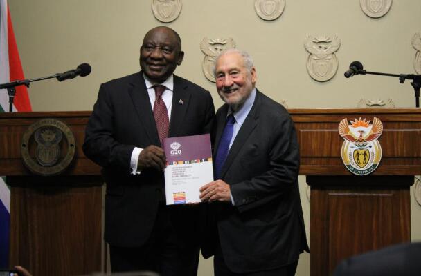 11月4日,在南非立法首都开普敦,二十国集团应对全球不平等问题特别独立专家委员会主席约瑟夫·施蒂格利茨(右)向南非总统拉马福萨提交关于全球不平等问题的报告。新华社发(沙姬拉·泰比摄)