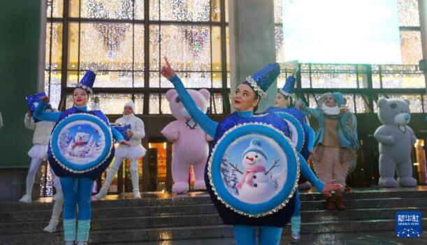 12月15日,在白俄罗斯明斯克,演员们在新年树亮灯仪式上表演。 当天,在白俄罗斯首都明斯克的十月广场,新年树上的灯饰被点亮。 新华社发(任科夫摄)