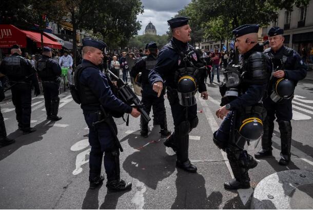9月10日,警察在法国巴黎夏特莱广场附近的游行示威现场警戒。新华社发(奥雷利安·莫里萨尔摄)