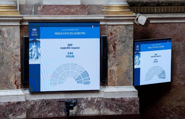 这是10月16日在位于法国巴黎的国民议会拍摄的第二项不信任动议投票结果。法国国民议会16日对两项针对政府的不信任动议进行了投票,动议最终都未获通过,政府未被议会推翻。新华社发(奥雷利安·莫里萨尔摄)