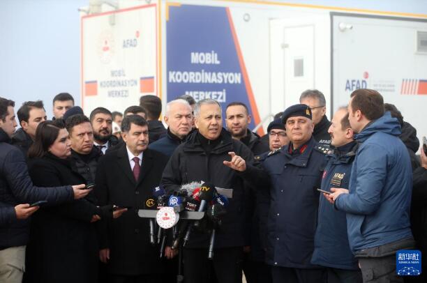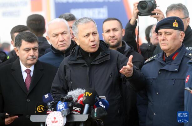 12月24日,土耳其内政部长阿里·耶尔利卡亚(中)在安卡拉省哈伊马纳区一座村庄附近的坠机现场接受媒体采访。新华社发(穆斯塔法·卡亚摄)