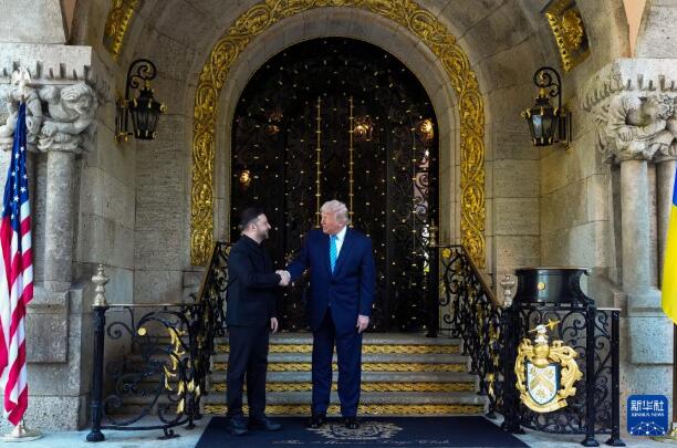 12月28日下午,美国总统特朗普在美国佛罗里达州海湖庄园同乌克兰总统泽连斯基举行会晤。这是特朗普在海湖庄园门口迎接泽连斯基。新华社/美联