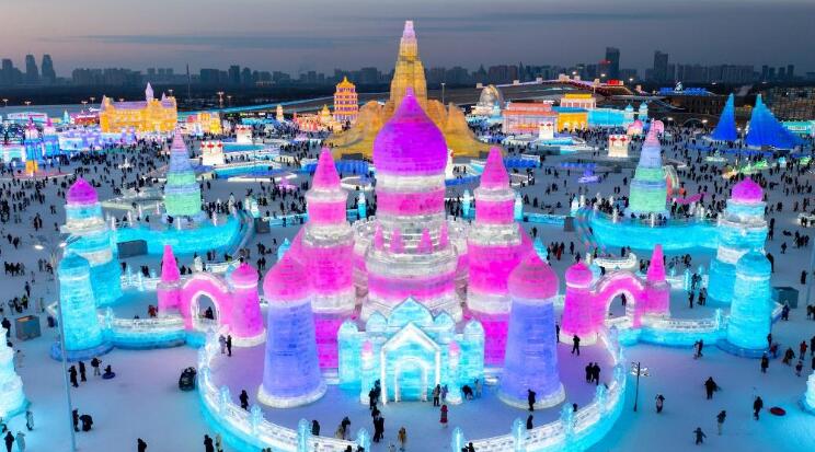 2026年1月1日,游客在哈尔滨冰雪大世界园区内游玩,欢庆新年的到来(无人机照片)。新华社发(王昭博 摄)