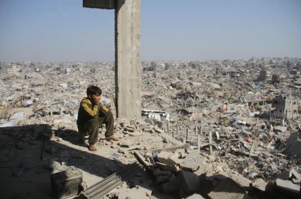 2025年1月29日,在加沙地带杰巴利耶难民营,一名巴勒斯坦少年望向废墟。新华社发(阿卜杜勒拉赫曼·萨拉马摄)