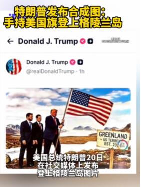 新华社华盛顿1月20日电美国总统特朗普20日凌晨在社交媒体上发布图片,他手拿美国国旗登上格陵兰岛,身后站着美国副总统万斯和国务卿鲁比奥,旁边指示牌上写着“格陵兰岛2026年成为美国领土”。
