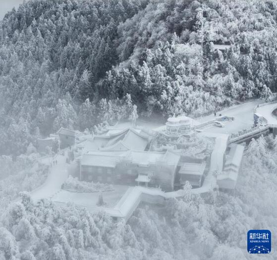 1月22日在湖南省衡阳市南岳衡山风景区拍摄的冰雪雾凇(无人机照片)。 连日来,湖南省衡阳市南岳衡山风景区出现了冰雪雾凇景观,银装素裹的山林在云海里若隐若现,吸引众多游客前来赏雪游玩。 新华社发(曹正平 摄)