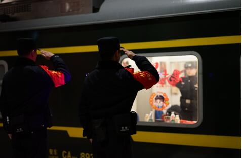 2月2日,北京铁路公安处北京西站派出所民警与即将发车的K4069次列车乘警敬礼道别。(北京铁路公安处供图)