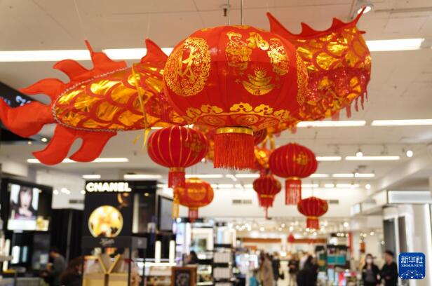 这是2月4日在美国纽约皇后区法拉盛一家商场内拍摄的春节装饰。 近日,在美国纽约皇后区法拉盛,春节主题装饰和商品在一些商场和街边商铺出现,增添了喜庆的节日氛围。 新华社记者 张凤国 摄