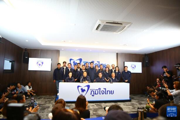2月8日,泰国看守政府总理、自豪泰党党首阿努廷(前左二)在曼谷出席新闻发布会。 泰国看守政府总理、自豪泰党党首阿努廷8日晚召开新闻发布会说,自豪泰党在国会下议院选举中取得胜利。