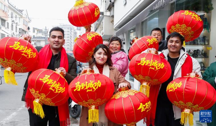 2月10日,在江苏省淮安市淮阴区营中社区,淮阴师范学院留学生和社区居民一起挂灯笼。 2月10日是北方小年,各地春节氛围日益浓厚。 新华社发(赵启瑞摄)