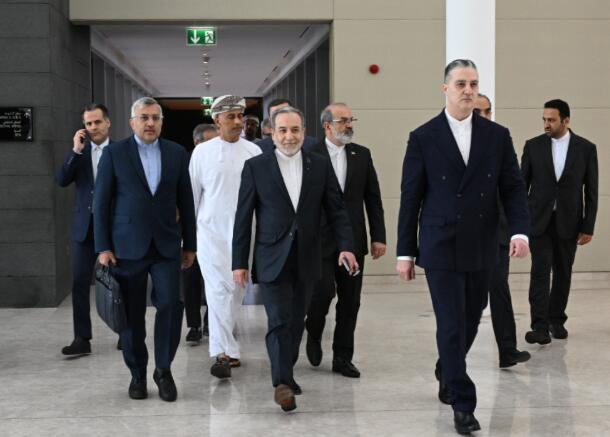 2月6日,伊朗外长阿拉格齐(前中)率团前往位于阿曼首都马斯喀特的会谈地点。新华社发