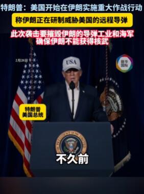 美国东部时间2时30分(北京时间15时30分)许,美国总统特朗普说,美国正在伊朗展开大规模军事行动,要把伊朗导弹工业“夷为平地”。特朗普还称伊朗正在研制威胁美国的远程导弹。此次袭击要摧毁伊朗的导弹工业,消灭伊朗海军,并确保伊朗不能获得核武器。