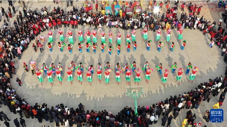 3月1日,秧歌队员在甘肃省和政县表演秧歌(无人机照片)。 元宵节将至,各地举办丰富多彩的活动,喜迎佳节。 新华社发(史有东摄)