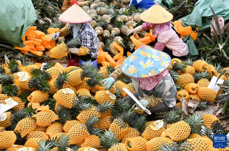 3月12日,农民在海口大坡镇将凤梨打包装箱。 近日,海南省海口市琼山区大坡镇的金钻凤梨种植基地迎来集中采收期,当地农户抢抓农时采摘凤梨。 新华社记者 郭程 摄