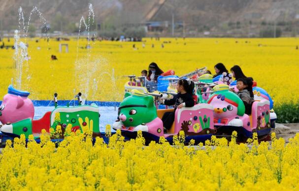 甘肃省陇南市武都区角弓镇硝坝子村油菜花基地里,游客在小型游乐园玩耍。新华社记者 李杰 摄