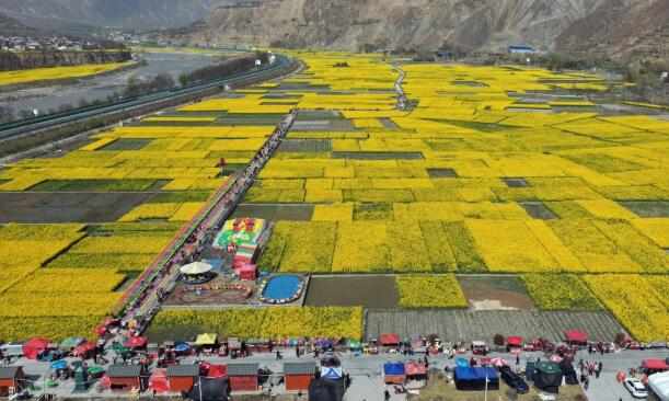 在武都区角弓收费站前,车流如织,金黄的花海吸引着省内外游客。走在硝坝子村油菜花基地旁的小道上,卖烤肠、卖饮料、卖草莓的,租用汉服的,不一而足。