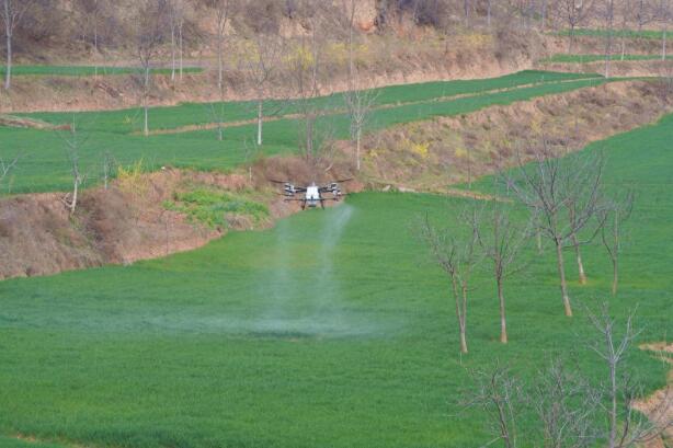 甘肃省陇南市成县苏元镇水坝村,无人机正在为小麦开展喷防服务(无人机照片)。(陈争强 摄)