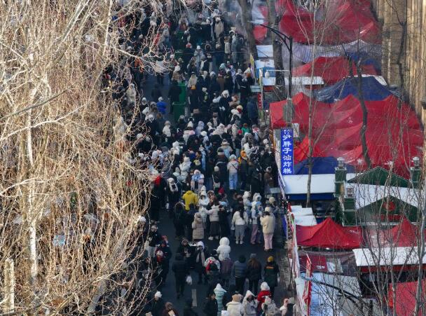 1月14日,哈尔滨市道里区红专街早市人流熙攘(无人机照片)。新华社发(张树 摄)