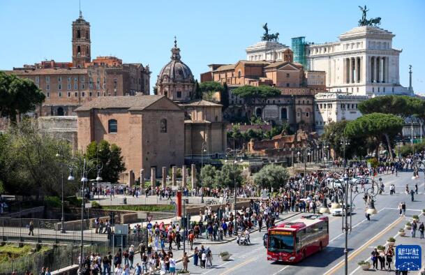 4月4日,人们走在意大利首都罗马的帝国广场大道上。 复活节假期到来,意大利首都罗马迎来客流高峰,人们来到斗兽场、许愿池、西班牙广场等标志性景点参观游览,享受假日时光。 新华社记者 王楷焱 摄